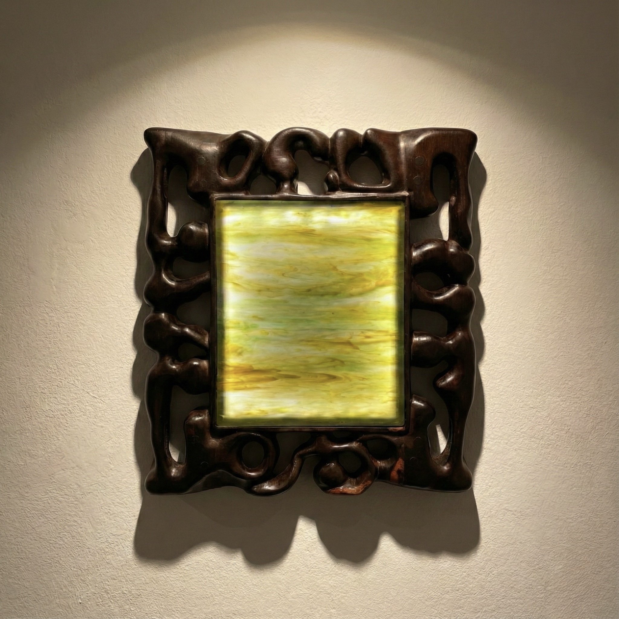 ㄨ Inquire Sakweka - OBJG-01, 2025. Stained glass, hand carved ebony wood frame LED backlight structure AA battery x3 - 50x45x6Private collection
