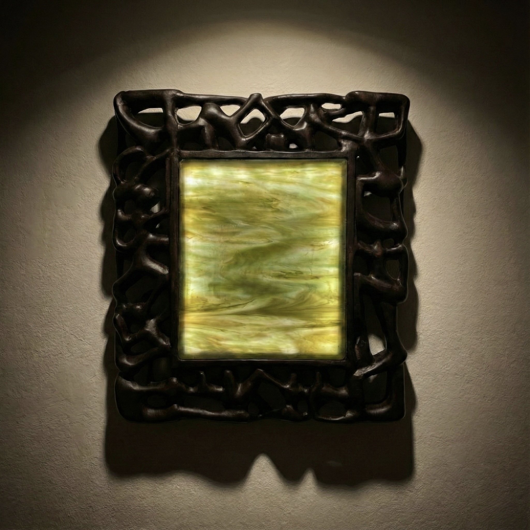 Inquire ㄨ Sakweka - OBJG-02, 2025. Stained glass, hand carved ebony wood frame LED backlight structure AA battery x3 - 50x45x6Private collection