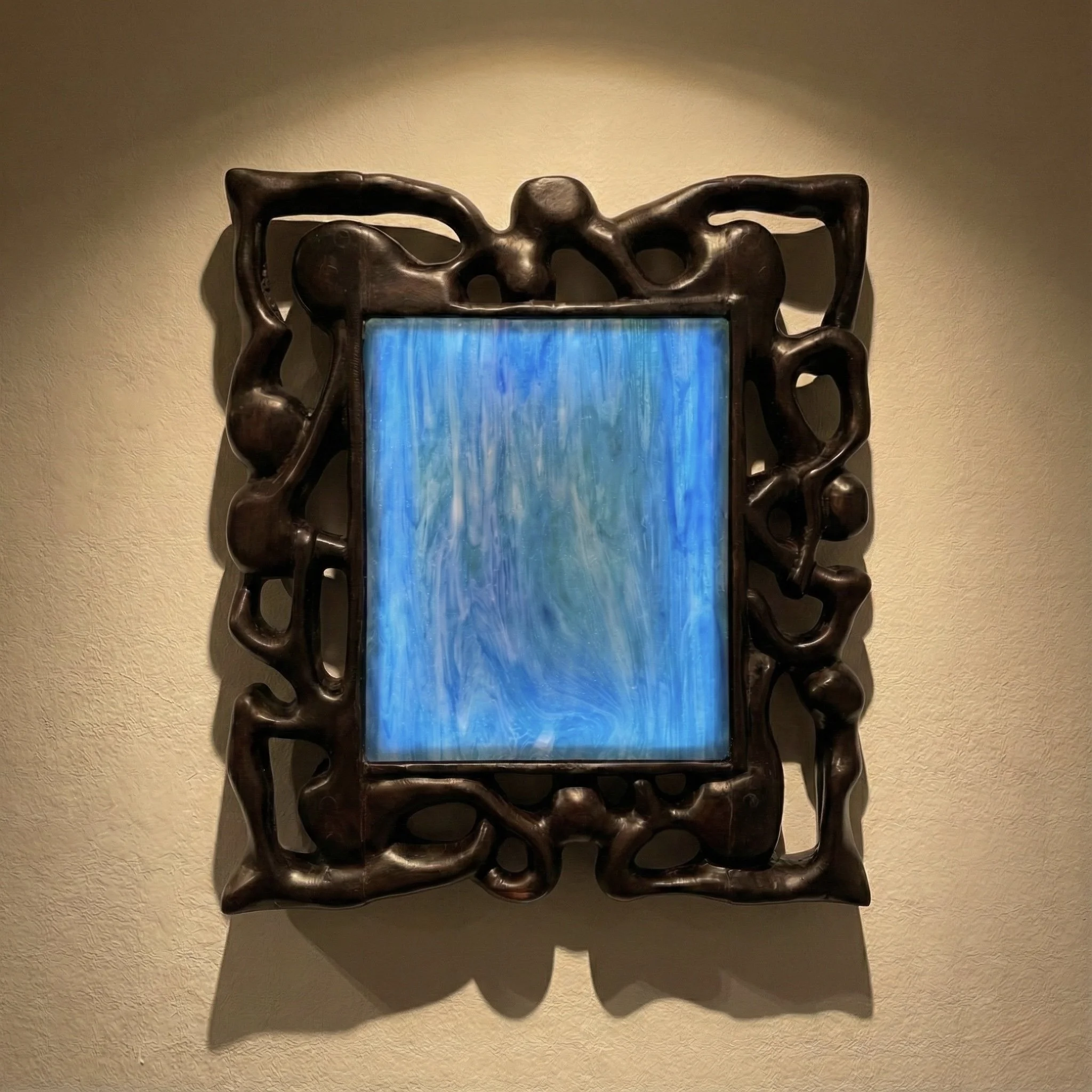 Inquire ㄨ Sakweka - OBJB-03, 2025. Stained glass, hand carved ebony wood frame LED backlight structure AA battery x3 - 50x45x6Private collection