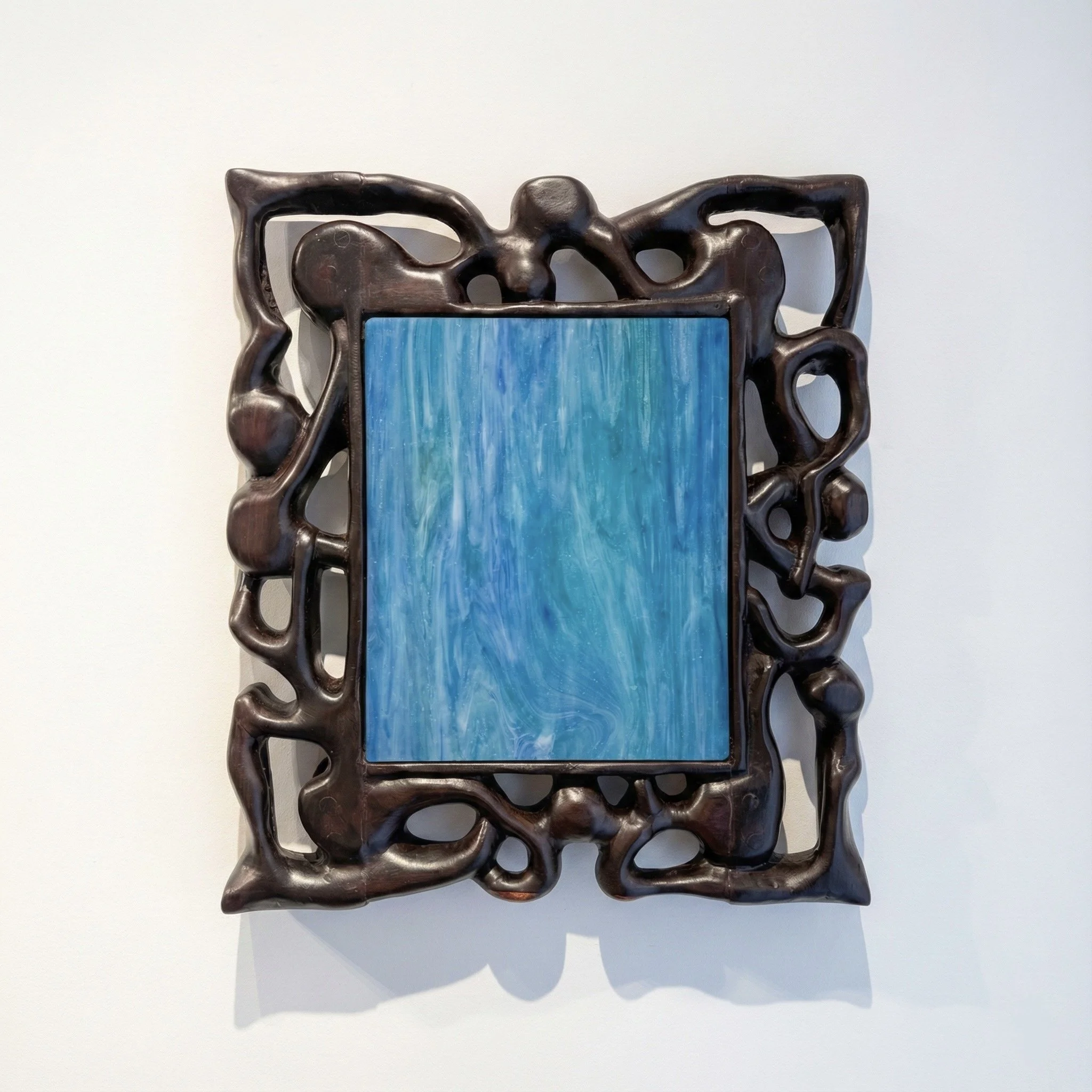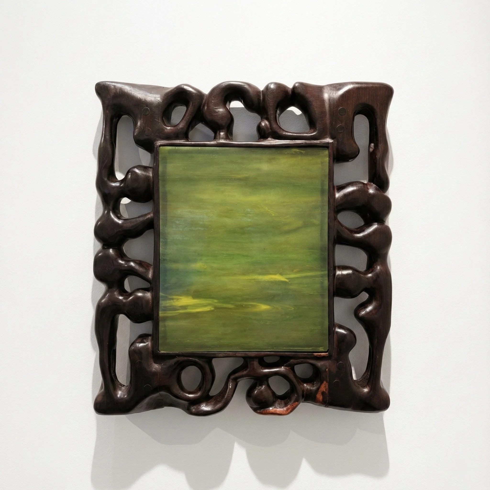 Sakweka - OBJG-01, 2025. Stained glass, hand carved ebony wood frame LED backlight structure AA battery x3 — 50x45x6