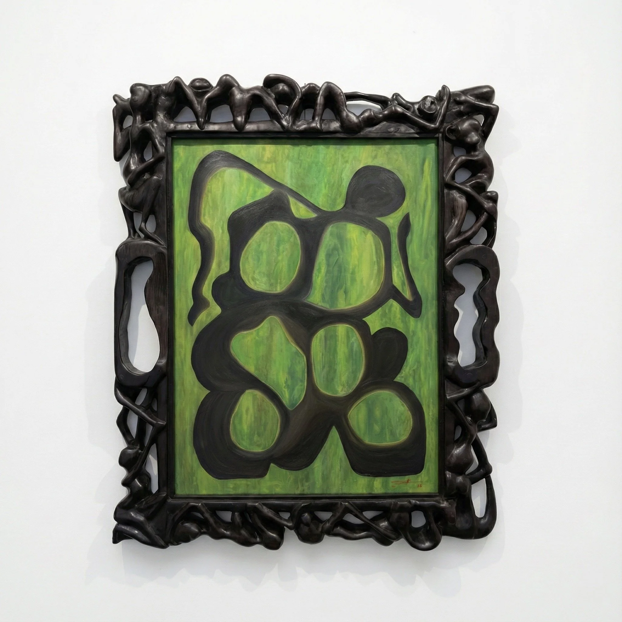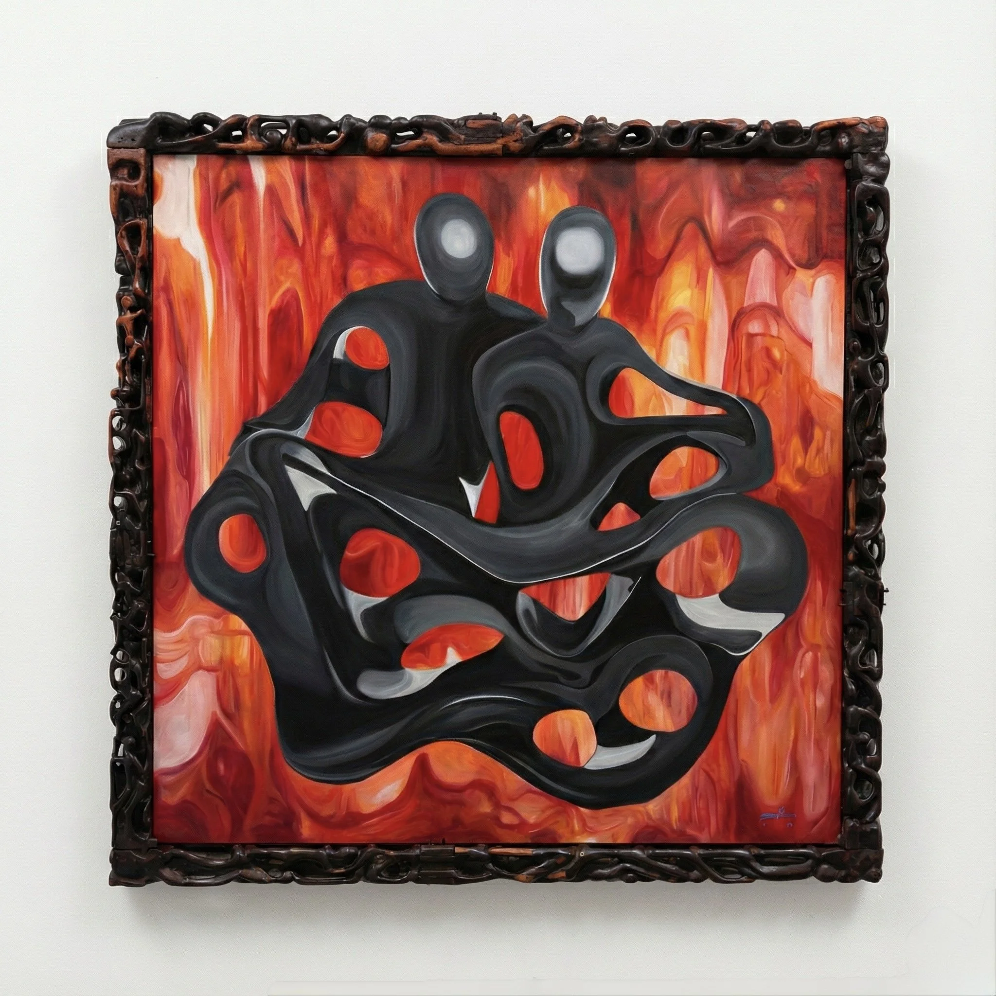 Sakweka - Relationships, 2025. Oil on canvas, hand carved ebony wood frame — 233x233x11